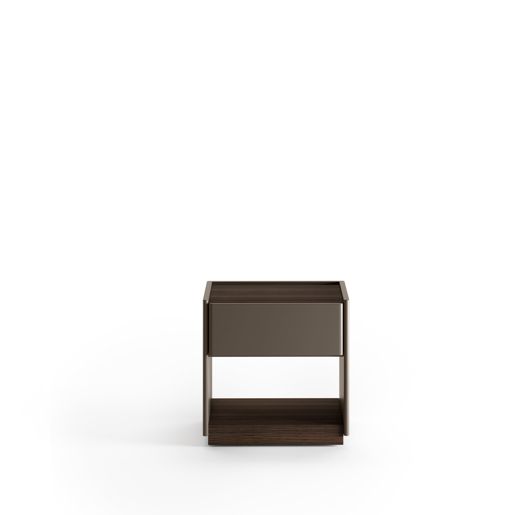 The 5050 bedside table is a streamlined design with refined detailing. Finished with rounded countours, the box-shaped piece in solid oak features a single drawer and an open shelf for concealed and exposed bedside storage.
